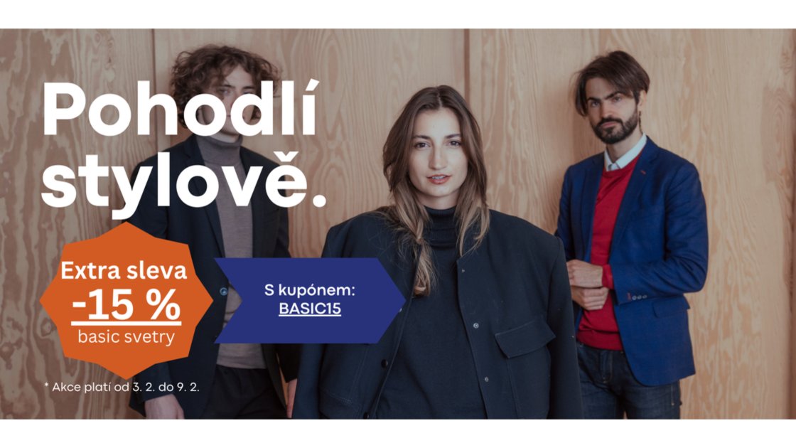 Extra sleva platí jen do neděle 9. února! V dalších týdnech přijdou slevy na další kategorie, ale základní svetry jsou ve slevě právě teď.